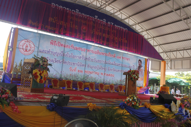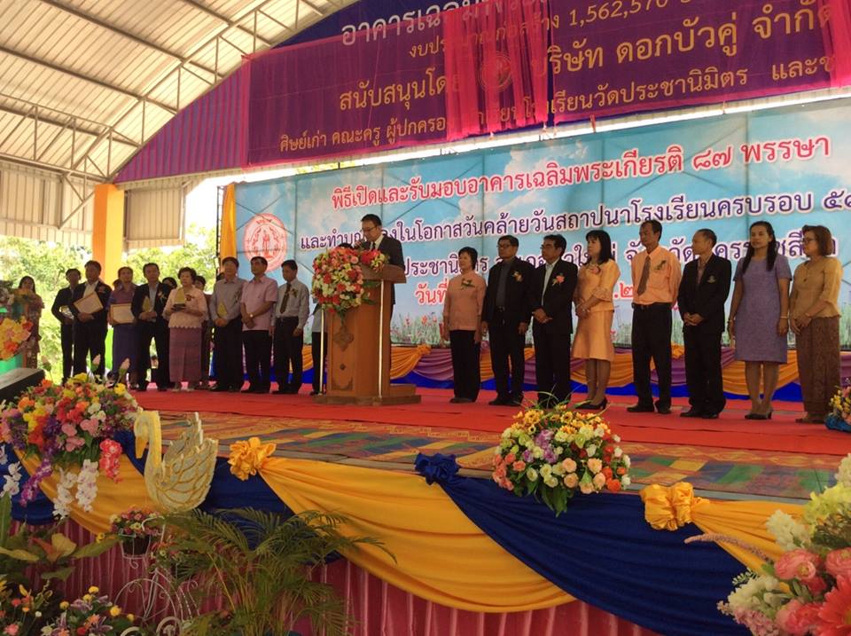 ในการนี้ ดร.สุนันทา ลีเลิศพันธ์ ประธานบริษัทดอกบัวคู่จำกัด เป็นตัวแทนมอบอาคาร และ คุณอนุวัฒน์ คณาจันทร์ รองนายกองค์การบริหารส่วนจังหวัดนครราชสีมา เป็นตัวแทนรับมอบอาคาร