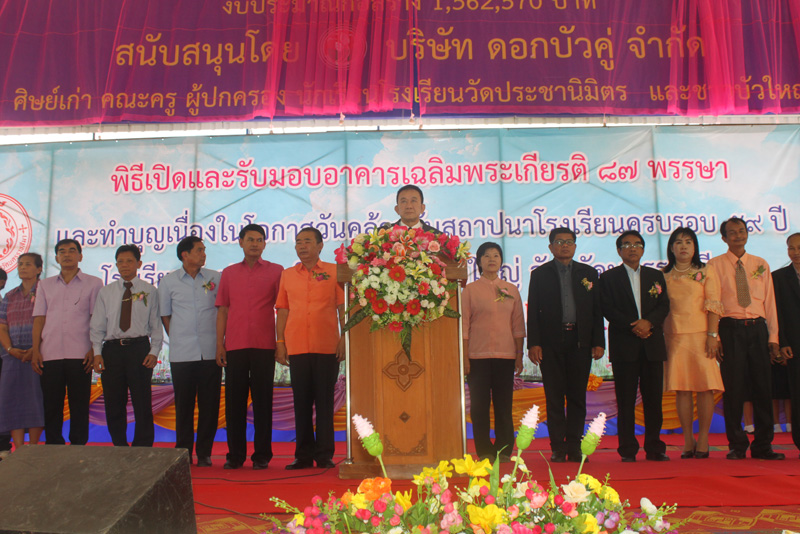 ในการนี้ ดร.สุนันทา ลีเลิศพันธ์ ประธานบริษัทดอกบัวคู่จำกัด เป็นตัวแทนมอบอาคาร และ คุณอนุวัฒน์ คณาจันทร์ รองนายกองค์การบริหารส่วนจังหวัดนครราชสีมา เป็นตัวแทนรับมอบอาคาร