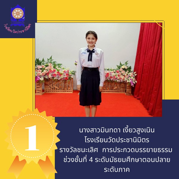 นางสาวมินทดา เงี้ยวสูงเนิน นักเรียนโรงเรียนวัดประชานิมิตร ที่ได้รับรางวัลชนะเลิศการประกวดบรรยายธรรม ช่วงชั้นที่ 4 ระดับมัธยมศึกษาตอนปลาย (ม.4-ม.6) ระดับภาค และได้เป็นตัวแทนเข้าประกวดบรรยายธรรมในระดับประเทศต่อไป |