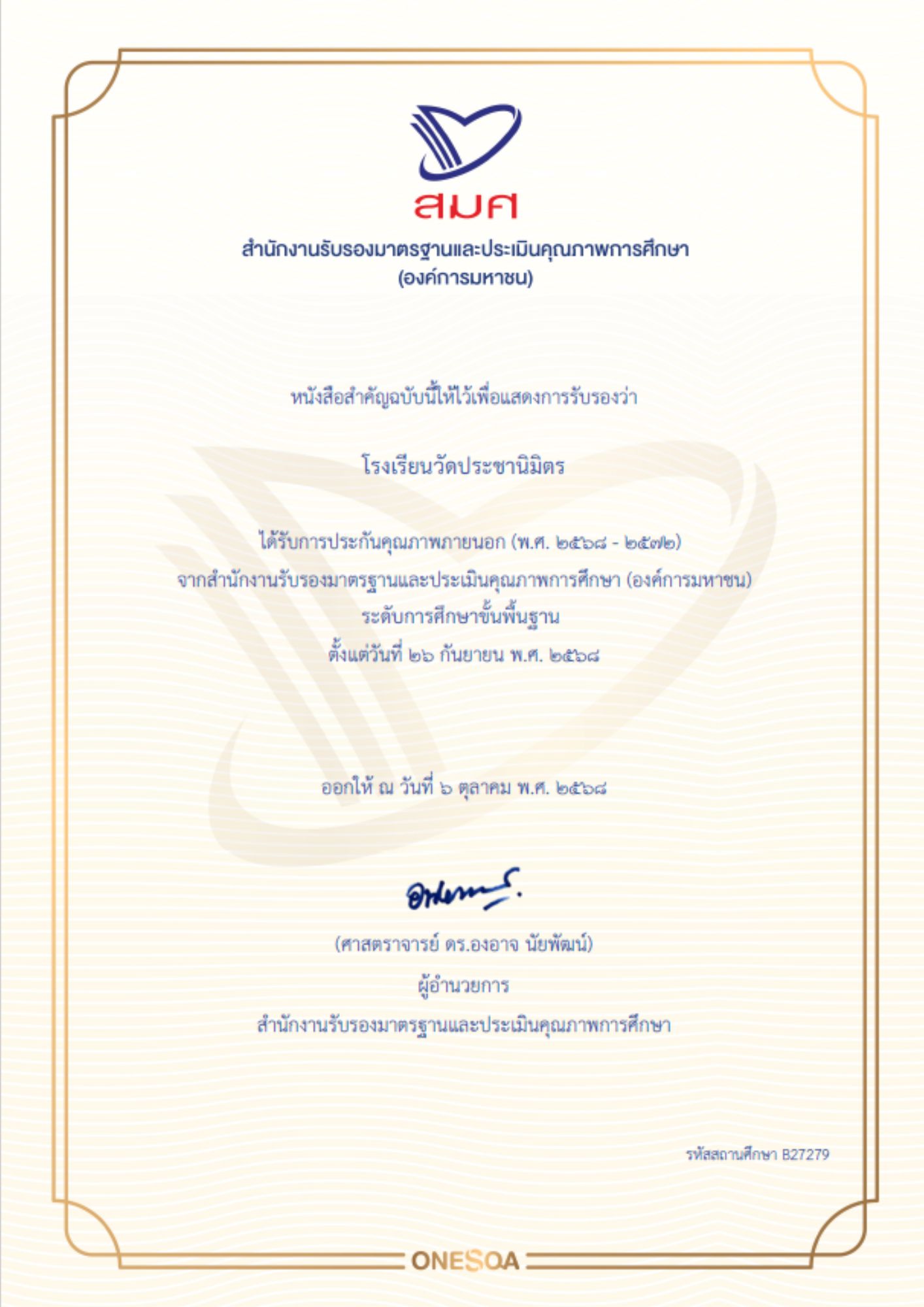 โรงเรียนวัดประชานิมิตรผ่านการรับรองการประกันคุณภาพภายนอก รอบ 5 (พ.ศ.2568-2572) จาก สมศ.