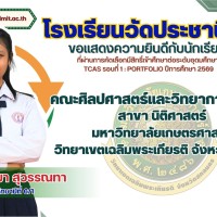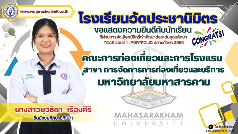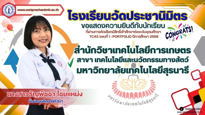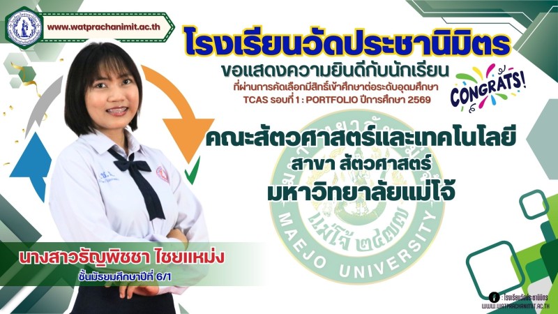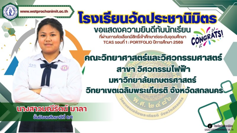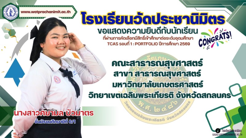 ผู้บริหารและคณะครูโรงเรียนวัดประชานิมิตร ขอแสดงความยินดีกับนักเรียนชั้นมัธยมศึกษาปีที่ 6 ทุกคน ที่ผ่านการคัดเลือกมีสิทธิ์เข้าศึกษาต่อระดับอุดมศึกษา TCAS รอบที่ 1 : PORTFOLIO ปีการศึกษา 2569