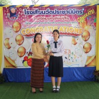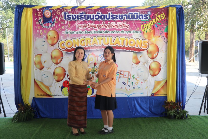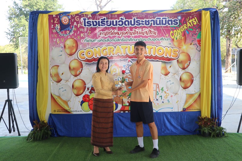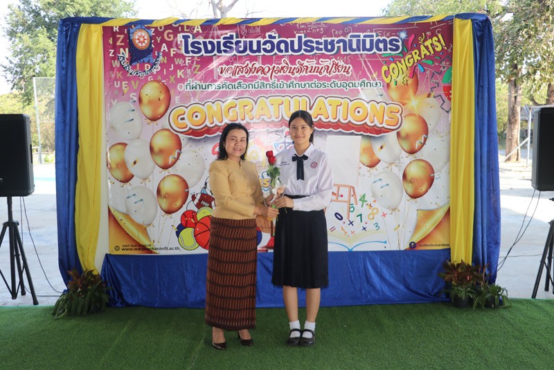 วันที่ 13 กุมภาพันธ์ 2569 นางสุภิดา ชื่นชมศาสตร์ ผู้อำนวยการสถานศึกษาโรงเรียนวัดประชานิมิตร มอบดอกไม้แสดงความยินดีกับนักเรียนที่ผ่านการคัดเลือกมีสิทธิ์เข้าศึกษาต่อในระดับอุดมศึกษา ปีการศึกษา 2568 |
